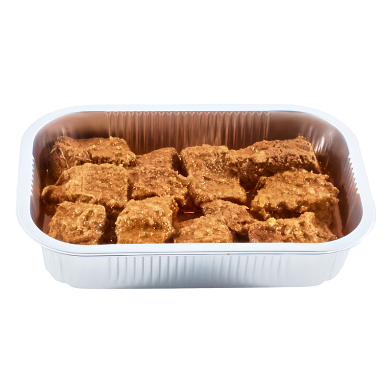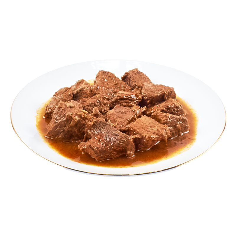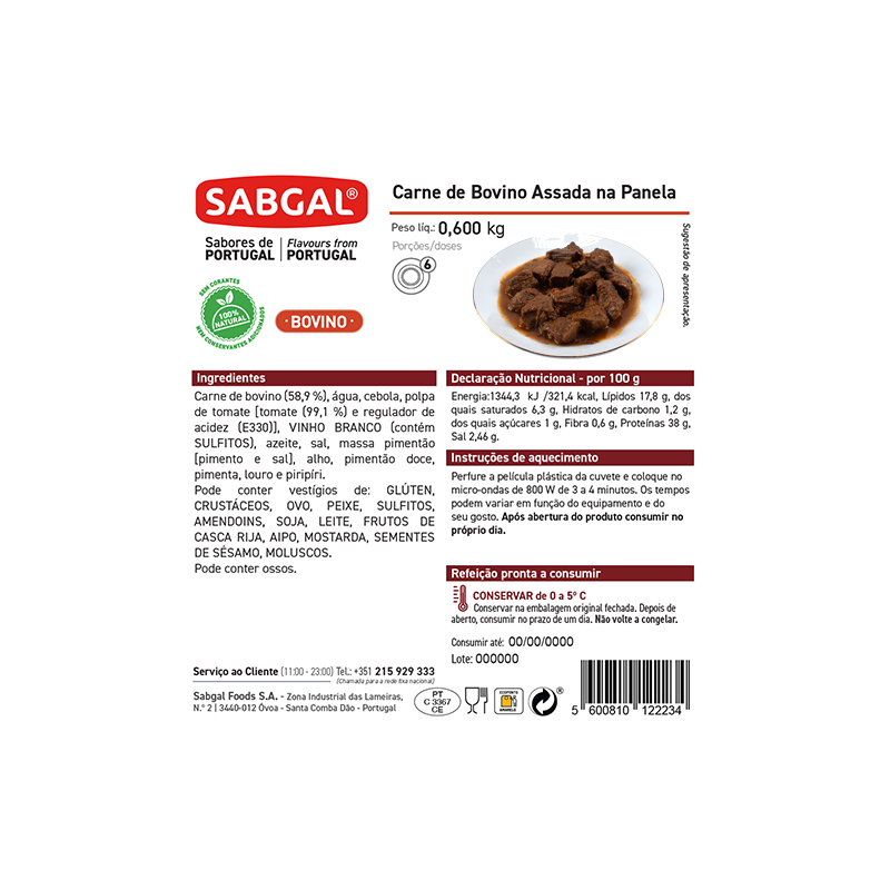 Carne de bovino (58,9 %), água, cebola, polpa de tomate [tomate (99,1 %) e regulador de acidez (E330)], VINHO BRANCO (contém SULFITOS), óleo alimentar [óleo de girassol refinado, óleo de bagaço de azeitona refinado (em proporções variáveis) e aroma natural de ervas], sal, massa pimentão [pimento e sal], alho, pimentão doce, pimenta, louro e piripíri.